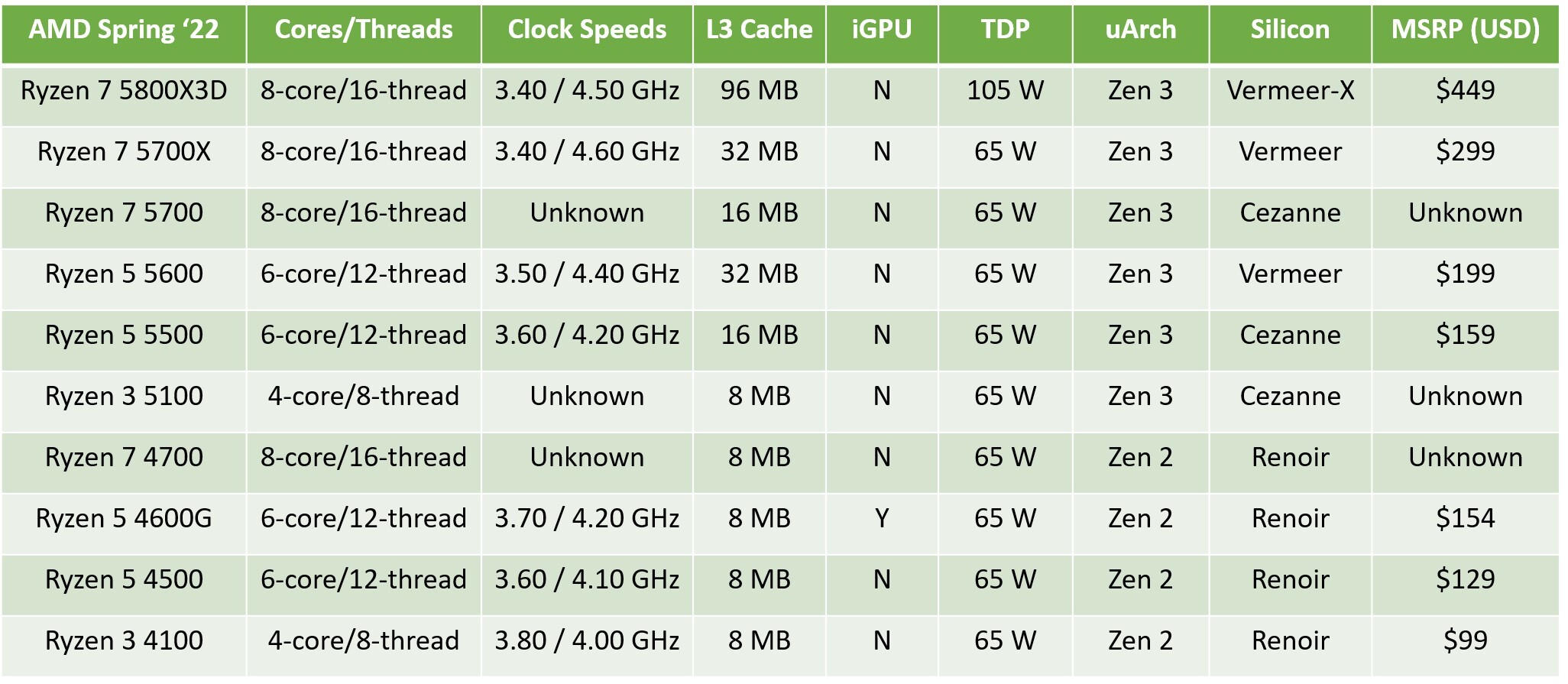Kemudian ada Ryzen 3 5100 dimana akan menjadi penerus Ryzen 3 3100. Ini adalah prosesor 4-core/8-thread berdasarkan silikon “Cezanne” yang sama dengan inti “Zen 3”, tetapi dengan hanya 8 MB cache L3, dan iGPU yang tersisa dinonaktifkan.