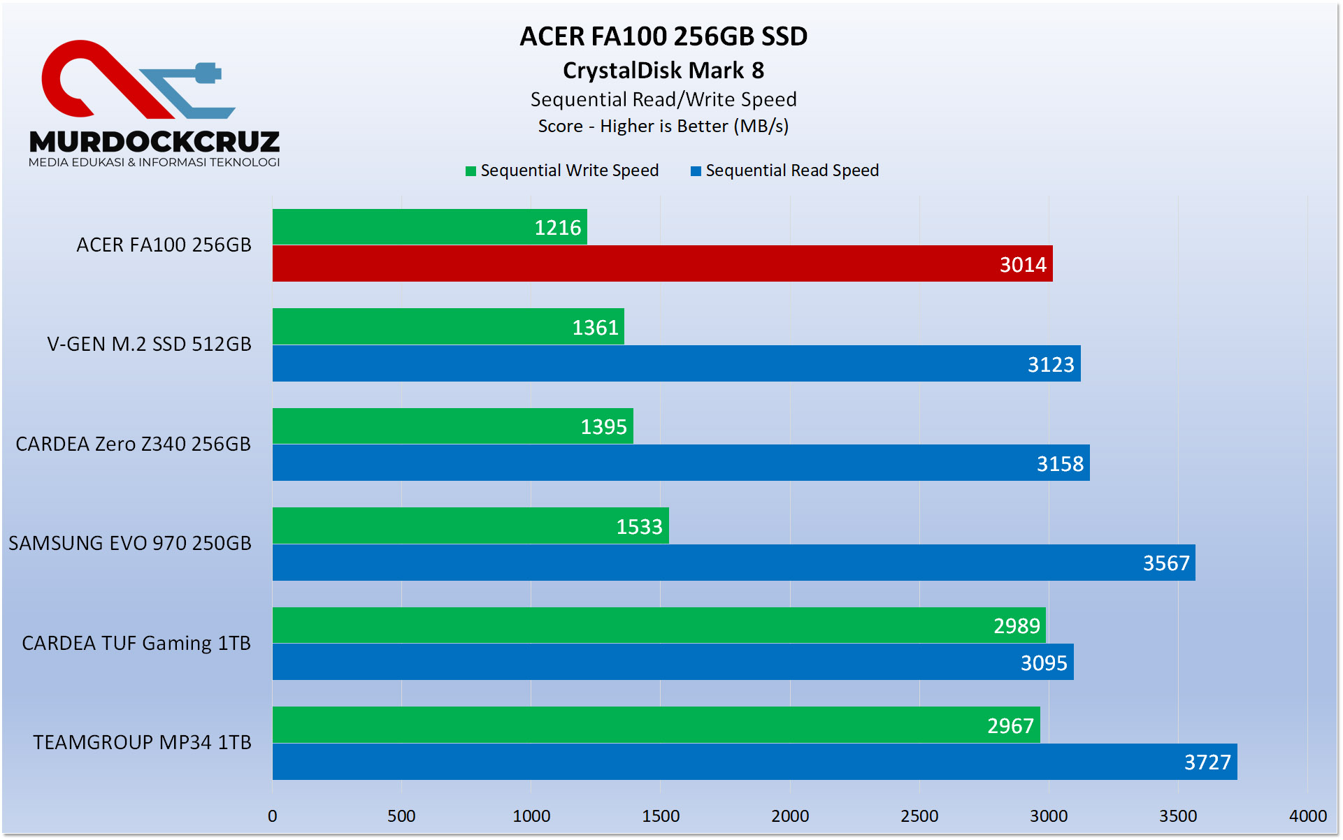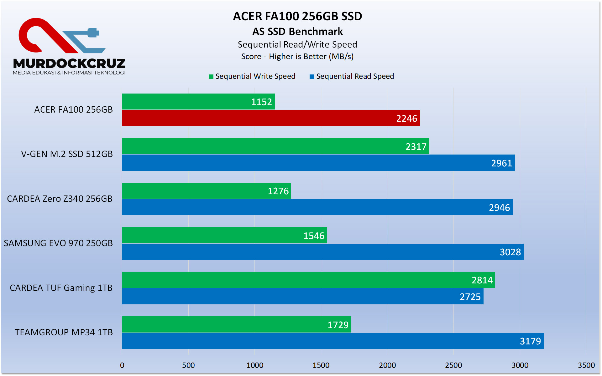 ACER FA100 sekali lagi mungkin bukan yang terbaik dari sisi performa. Malah kinerja write speed jauh lebih rendah dibanding kecepatan baca dan tergantung juga dengan varian kapasitas yang ditawarkan. Dari beberapa SSD NVMe yang pernah kami coba, FA100 versi 256 GB punya nilai paling bawah. Tapi jika kalian memakai opsi yang lebih besar, misal diatas 1 TB atau 2 TB, maka performa bakal lebih baik.