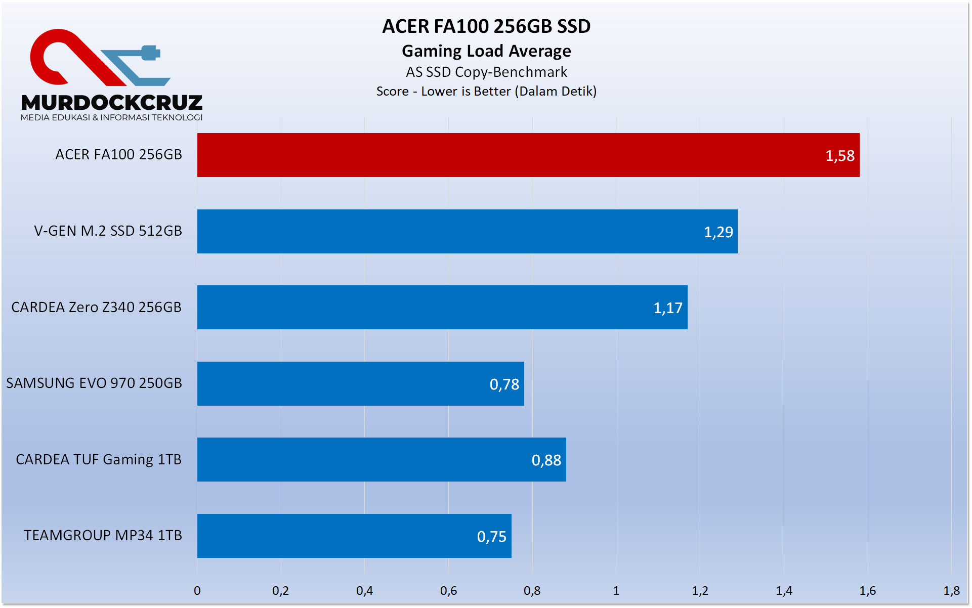 Gaming load Average di AS SSD Copy-benchmark juga jadi yang terlama dengan durasi hingga 1.58 detik. Seri tercepat masih ada ditangan TEAMGROUPn MP34 dan Samsung EVO 970.