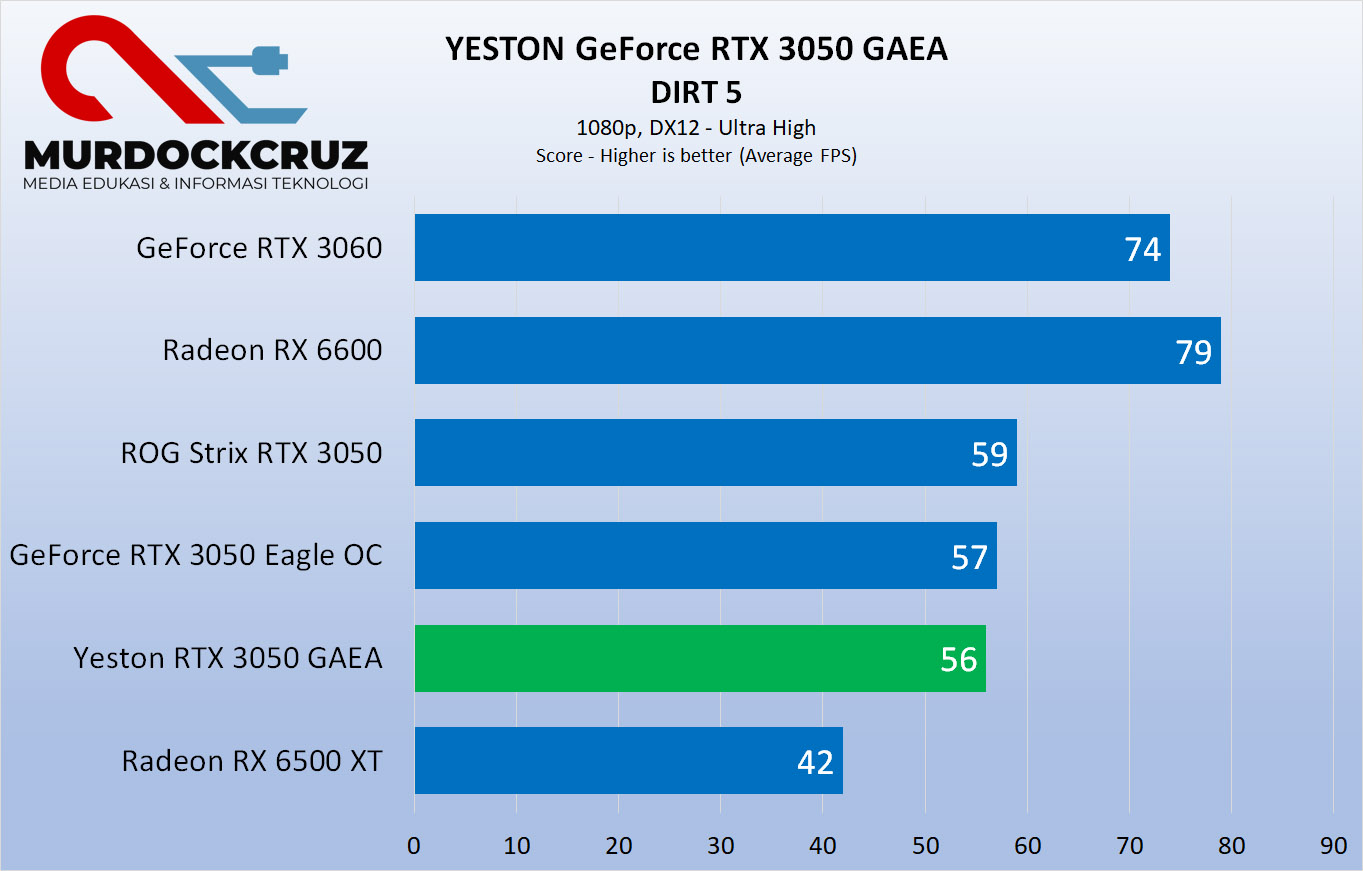 Di Dirt 5 juga sama, FPS hampir mirip dengan RTX dari Eagle GIGABYTE. Meskipun selisih sama RX 6500 XT jauh banget.