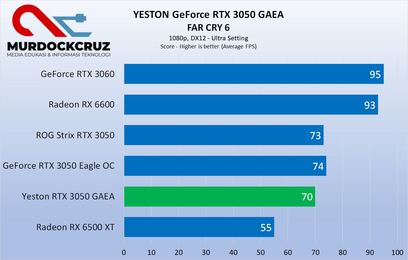 Lalu ada Far Cry 6, fps rata-rata dapet 70. Sekali lagi sedikit tertinggal dibanding RTX 3050 yang udah kami coba. Meskipun enggak jauh banget.