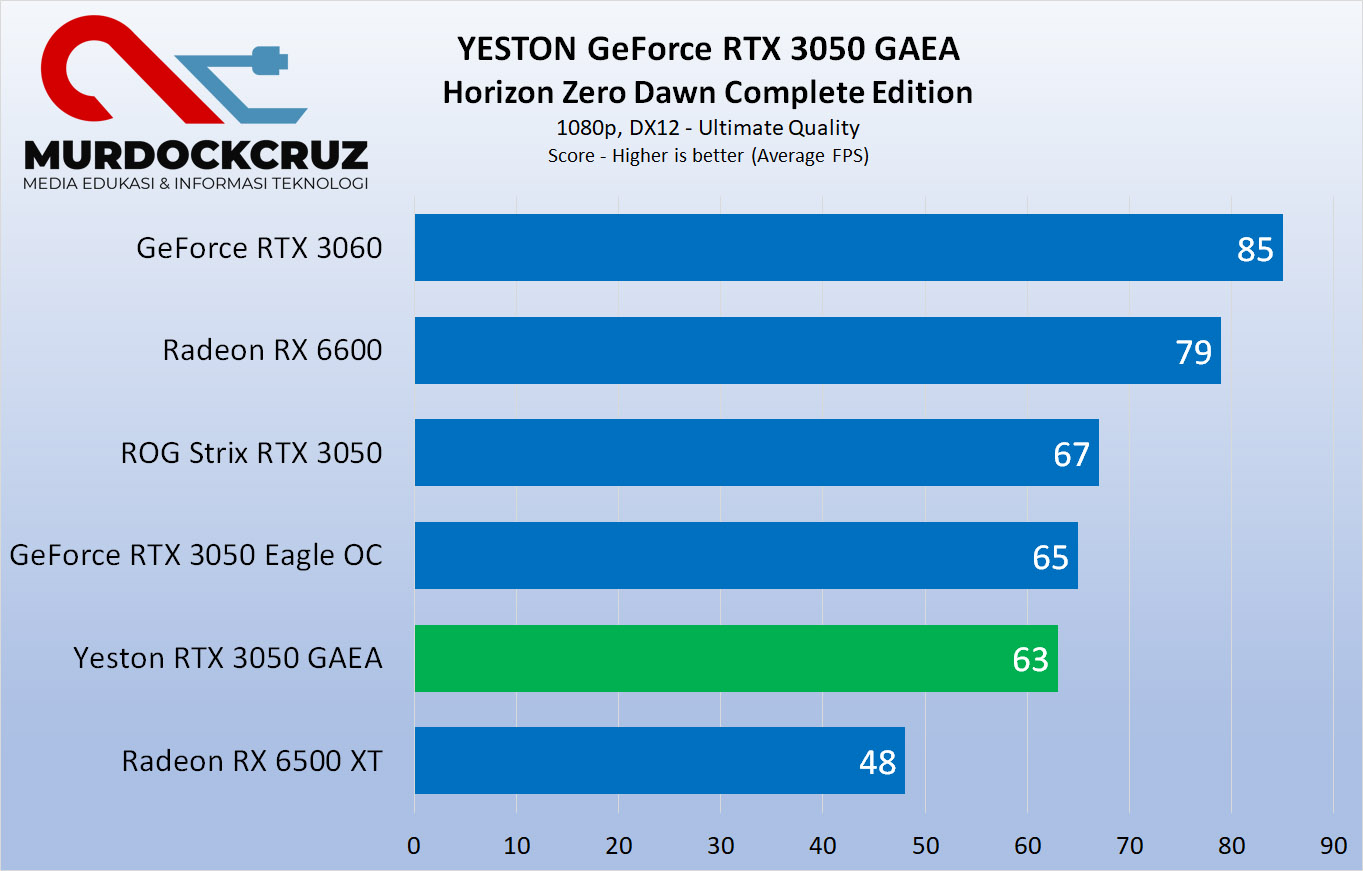 Di Horizon Zero Dawn, FPS rata-rata resolusi 1080p dapet 63, sedikit tertinggal dibanding seri RTX 3050 Eagle sama ROG Strix. Tapi enggak beda jauh sih.