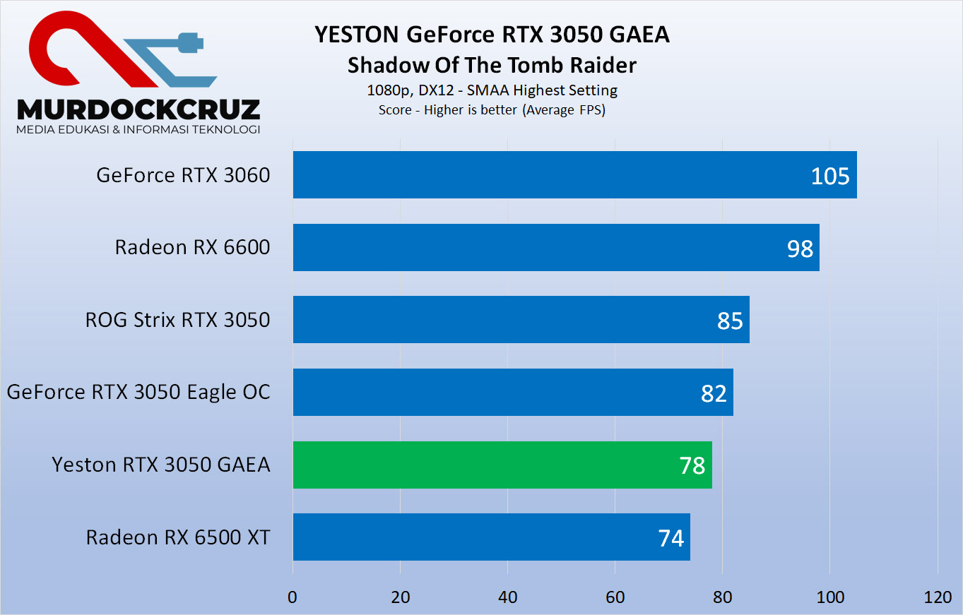 Di Shadow Of The Tomb raider FPS rata-rata dapet 78. Sedikit tertinggal dibanding seri ROG Strix RTX 3050 atau EAGLE dari GIGABYTE.