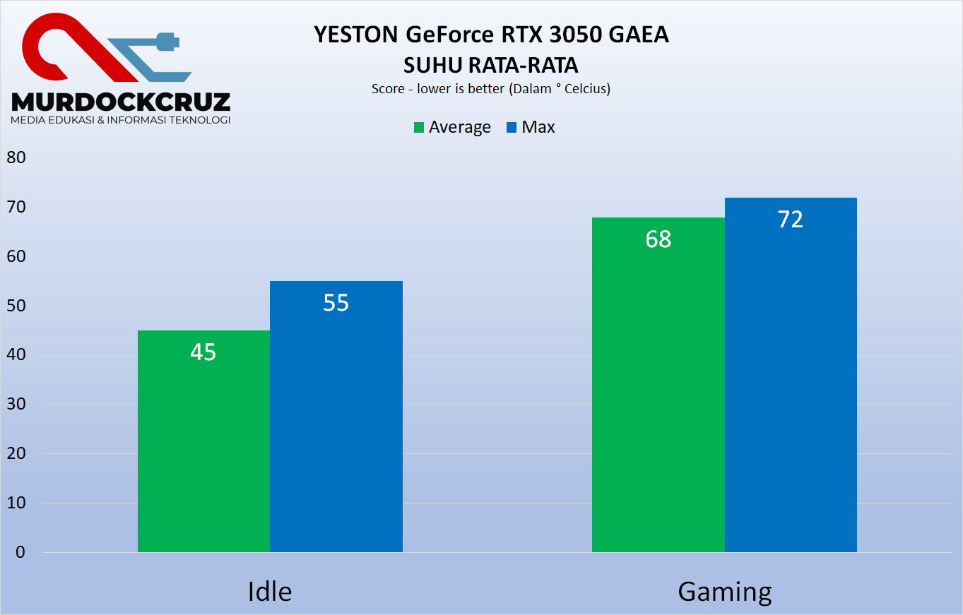 Buat suhu nih, Yeston GeForce RTX 3050 GAEA punya cooling yang adem banget. Malah jadi salah satu opsi terbaik. Suhu rata-rata Cuma dapet 68° Celsius saat main game.
