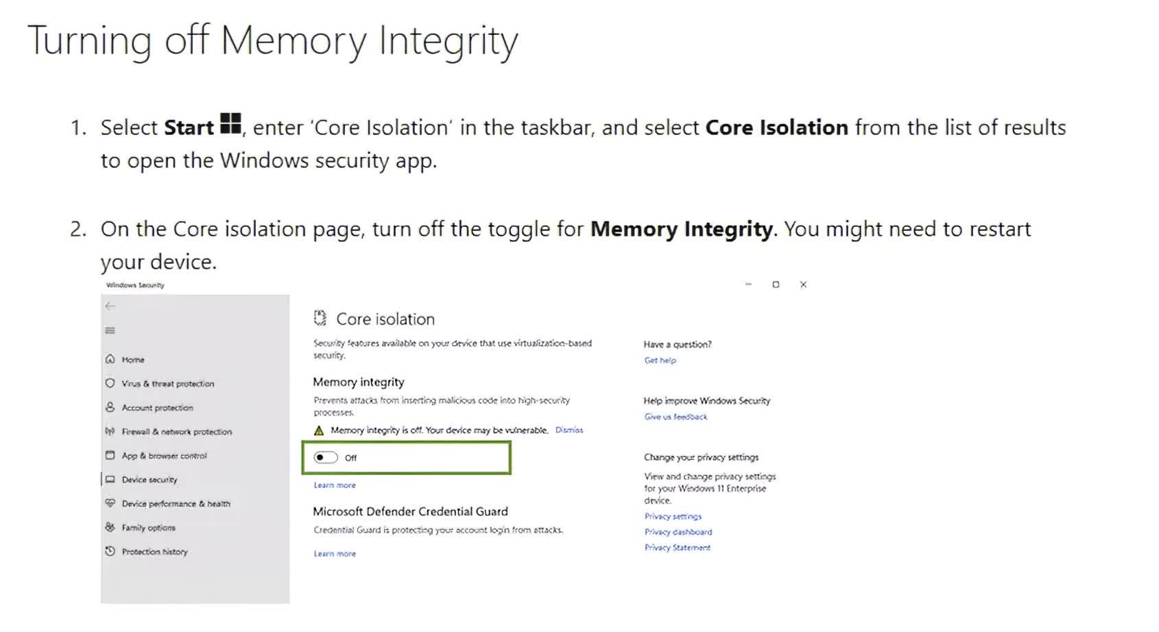 Solusi pertama dari Microsoft adalah menonaktifkan HVCI, ini juga dikenal sebagai Memory Integrity. Menurut Microsoft, “Memory Integrity membantu mencegah penyerang menyuntikkan kode berbahaya mereka sendiri dan membantu memastikan bahwa semua driver yang dimuat ke OS ditandatangani dan dapat dipercaya.”