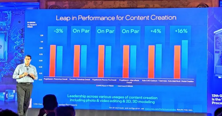 Foto-foto presentasi Intel yang berisi benchmark Core i9 13900K menggambarkan prosesor sebagai 6-22% lebih cepat daripada AMD Ryzen 9 7950X dalam game, yang pada gilirannya bisa membawa tahta CPU game terbaik dari perspektif kinerja mentah. Petunjuk ini agak meluas ke aplikasi kreatif juga, seperti yang ditunjukkan pada gambar yang diperoleh Videocardz, tetapi tidak hampir pada tingkat yang sama.