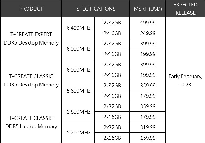 Sementara modul DDR5 T-CREATE CLASSIC hadir dalam spesifikasi 6.000 MHz dan 5.600 MHz, dan Memori Laptop DDR5 CLASSIC menawarkan frekuensi dalam 5.600 MHz dan 5.200 MHz, memungkinkan kreator untuk sepenuhnya mempercepat pengalaman kreatif mereka di komputer desktop, laptop, mini PC, dan ekspansi memori laptop workstation multi-core canggih.