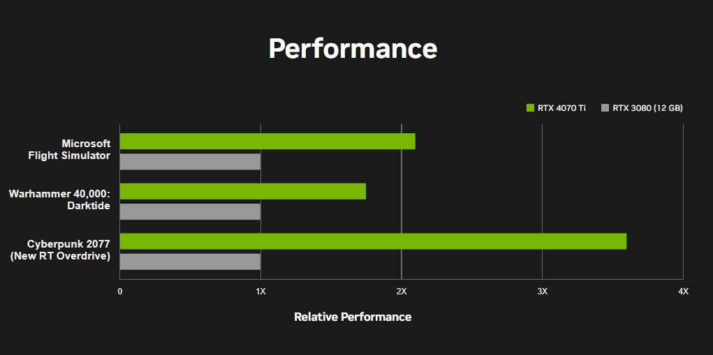 GeForce RTX 4070 Ti memiliki jumlah CUDA Cores hingga 7680 dan memori GDDR6X 12 GB. Dukungan teknologi DLSS 3 juga diklaim akan memberikan peningkatan kinerja relatif 12x yang luar biasa dibandingkan GeForce GTX 1080 Ti.