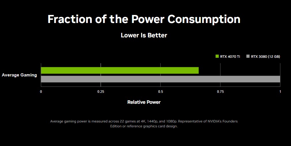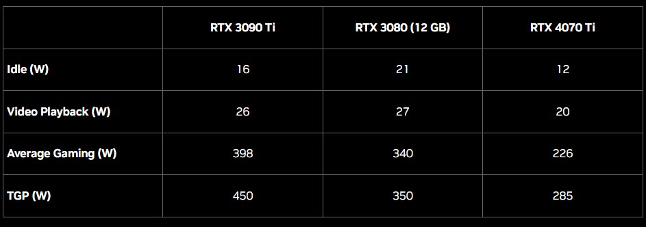 GPU ini sekali lagi bisa lebih baik dibanding GeForce RTX 3090 Ti, dan hematnya juga bakal lebih berasa. Ini menggunakan daya rata-rata 43% lebih sedikit saat bermain game: hanya 226W, dibandingkan 398W pada 3090 Ti. Dan saat idle, menjelajahi web, atau menonton video, penggunaan dayanya hampir tidak tercatat berkat peningkatan arsitektur Seri GeForce RTX 40.