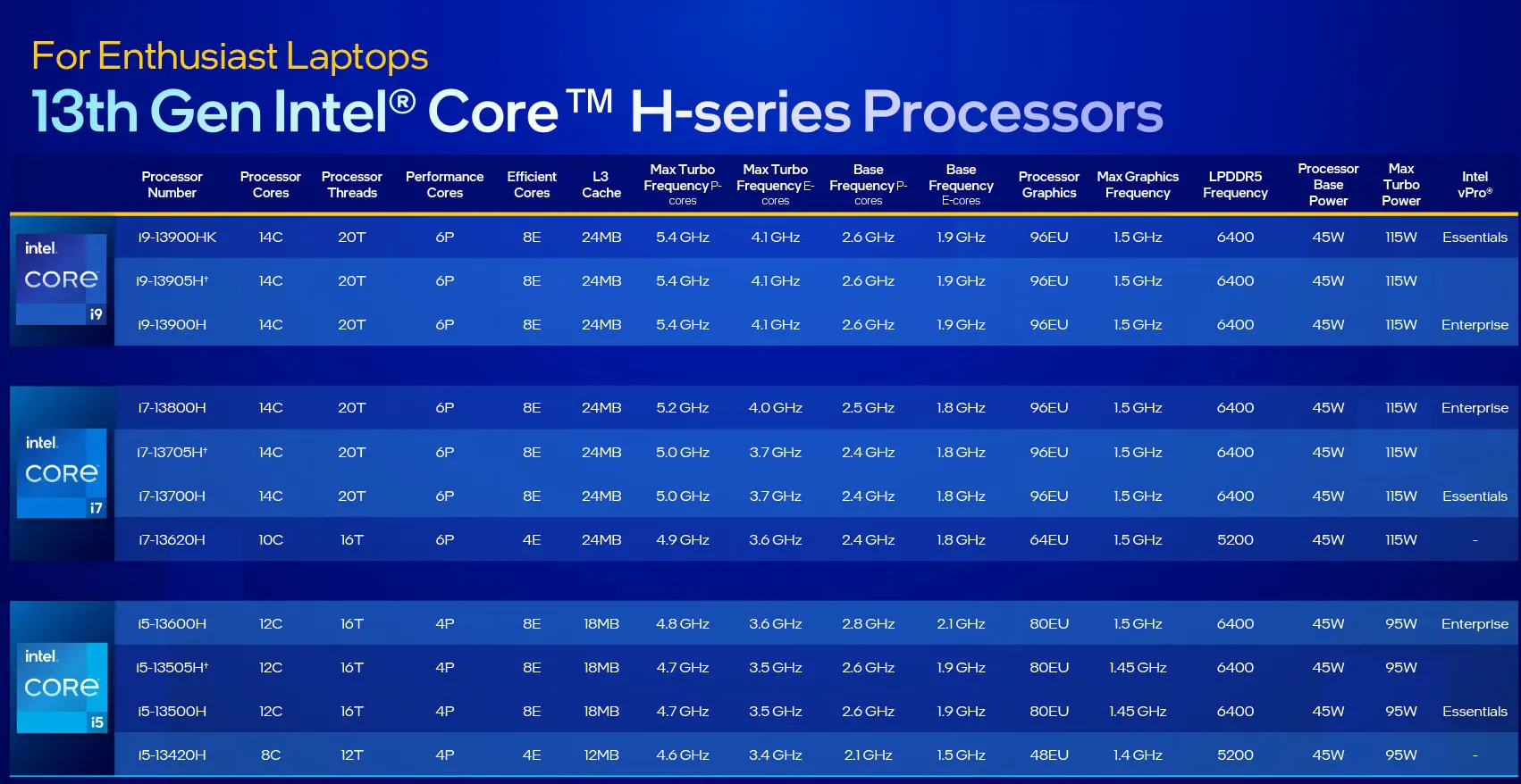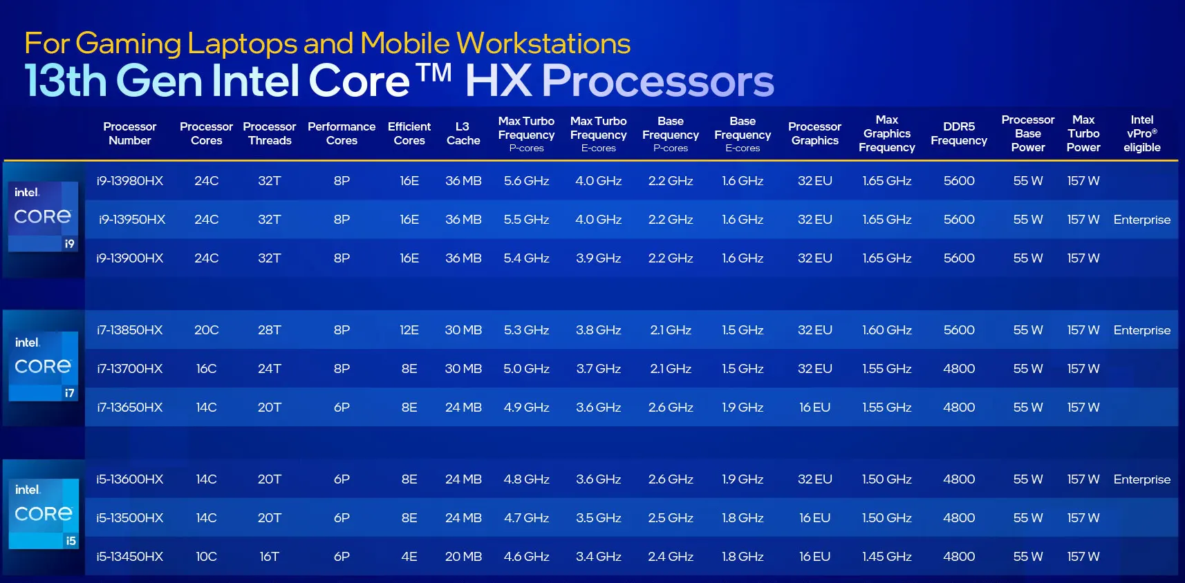 Seri Core HX Generasi ke-13 bisa ideal untuk para gamer, kreator di tempat, dan workstation mobile. Prosesor ini hadir dengan jumlah core hingga 8P+16E, menjadikannya prosesor mobile 24 core pertama. Chip diklasifikasikan memiliki TDP 55 W, dengan nilai daya turbo maksimum ditetapkan setinggi 155 W.