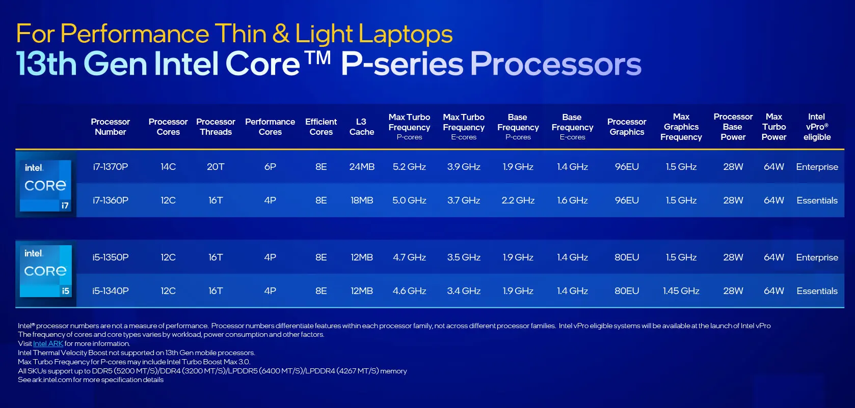 Segmen-P prosesor menargetkan laptop tipis dan ringan dengan daya 28 W, dan terdiri dari empat SKU yang mencakup ekstensi merek Core i7 dan Core i5. Bagian Core i7 teratas adalah 6P+8E, diikuti oleh bagian 4P+8E.