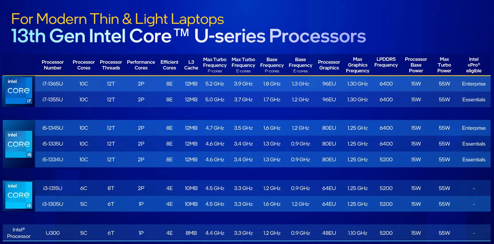 Seri Core U juga ditargetkan untuk laptop tipis yang lebih modern dan ringan plus memiliki daya terendah hingga 15W. Varian yang ditawarkan juga terhitung lengkap termasuk seri Core i5 maupun varian Core i3. Jadi, kita bisa melihat juga ada opsi budget untuk laptop terbaru berbasis Intel 13th Gen ini.