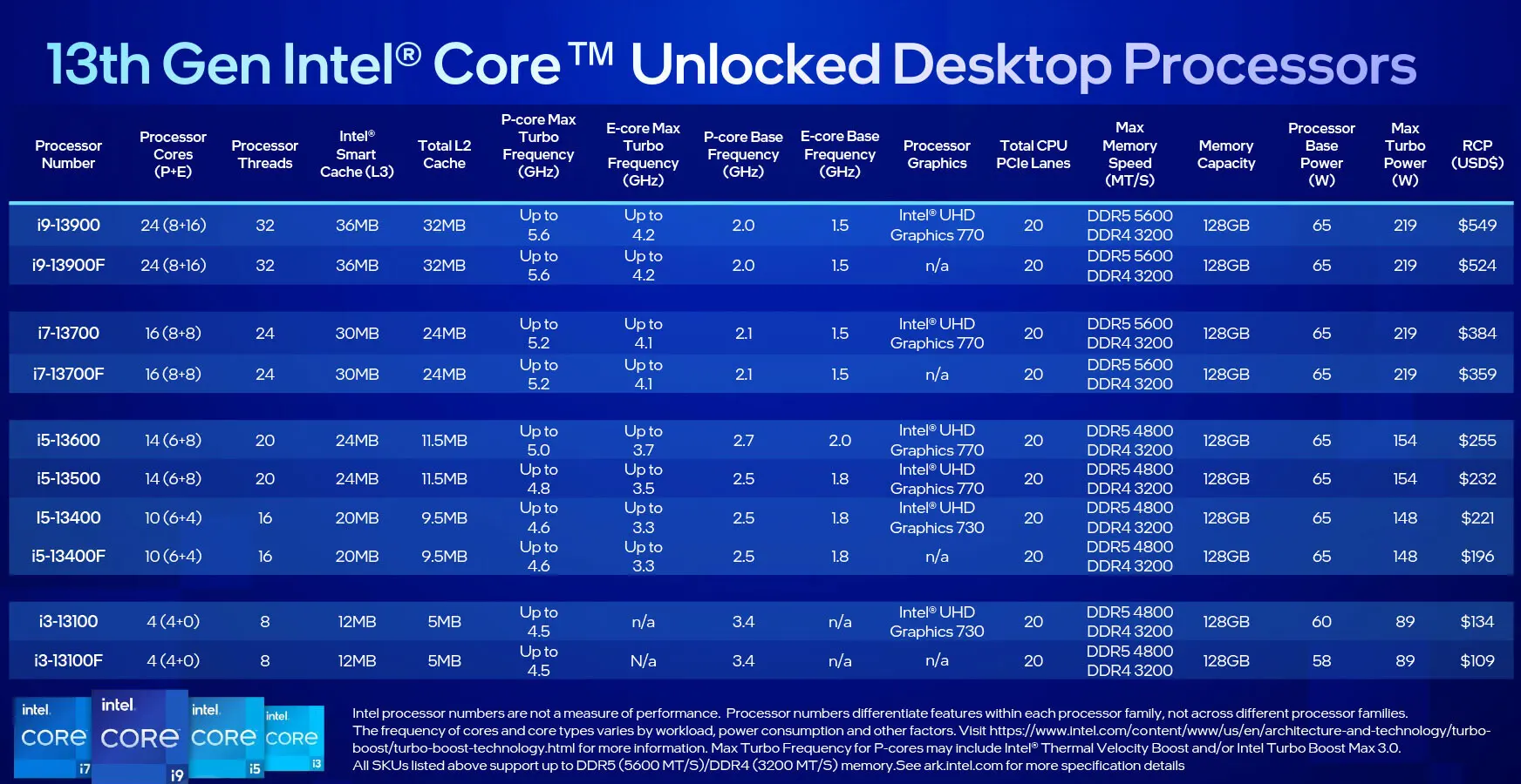 Masing-masing dari empat P-core ini memiliki 1,25 MB L2 cache, dan keempat P-core berbagi 12 MB L3 cache. Harga i3-13100 $134 atau kisaran 2 jutaan, dan i3-13100F $109 atau kisaran 1.6 jutaan. Core i3-13100 memiliki daya dasar 65 W dan daya turbo maksimum 89 W, sedangkan i3-13100F tidak memiliki iGPU, dan memiliki daya dasar yang sedikit lebih rendah yaitu 58 W. Kedua chip tersebut memiliki frekuensi P-core hingga 4,50 GHz.