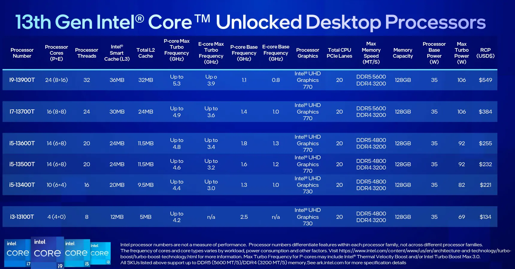 Selain itu, Intel memperkenalkan jajaran kecil SKU hemat daya Core i9 Generasi ke-13, Core i7, Core i5, dan Core i3 T-series, dengan daya dasarnya ditetapkan pada 35 W, dan daya turbo maksimum ditetapkan secara signifikan lebih rendah daripada yang tidak. -T bagian, berkisar antara 69 W hingga 106 W, yang berarti manajemen daya agresif yang sekencang prosesor mobile segmen-H.
