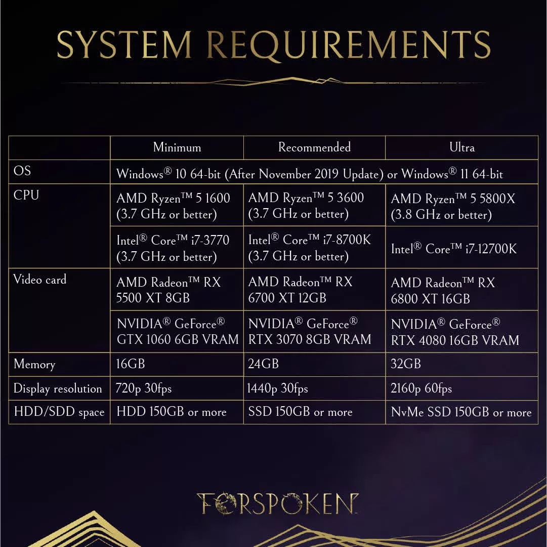 Nah, spesifikasi minimum untuk bisa memainkan Forspoken persyaratan CPU adalah Ryzen 5 1600 atau Intel Core i7-3770 dengan speed ideal diatas 3.7 Ghz. Sedangkan rekomedasi itu Ryzen 5 3600 atau Core i7-8700K. Untuk pilihan ultra kalian bahkan membutuhan opsi Ryzen 5 5800X atau 12700K.