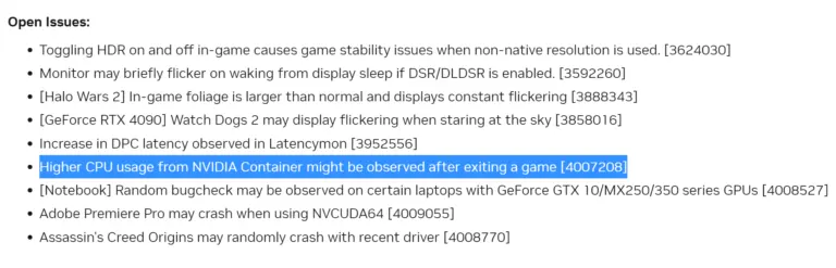 Nomor masalah 4007208 berbunyi, “Penggunaan CPU yang lebih tinggi dari NVIDIA Container dapat diamati setelah keluar dari game.” Beberapa pengguna menunjukkan penggunaan CPU hingga 10-15 persen dalam kondisi ini — meskipun itu tidak cukup untuk menghambat sebagian besar desktop game, tetapi lebih dari cukup untuk menjadi gangguan, terutama jika pengguna menggunakan PC untuk tugas intensif lainnya. Seperti membuka tiga tab Chrome sekaligus.