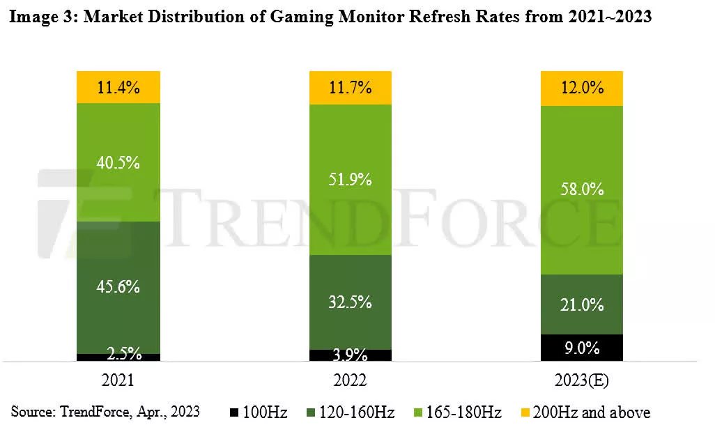 Refresh rate yang lebih tinggi bisa menjadi faktor pertama untuk menstabilkan dan mengangkat pasar tahun ini. Di sisi kelas bawah, beberapa merek mengganti monitor 75Hz mereka dengan model 100Hz. Secara keseluruhan, monitor gaming 100Hz mewakili 3,9 persen dari semua pengiriman monitor gaming tahun lalu dan mungkin mencapai 9 persen pada tahun 2023.