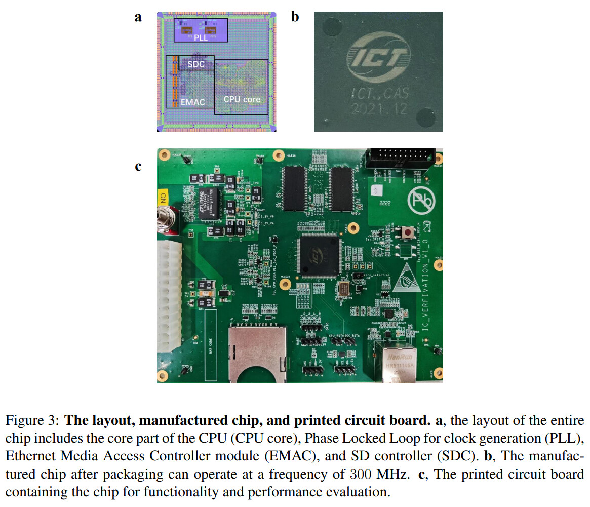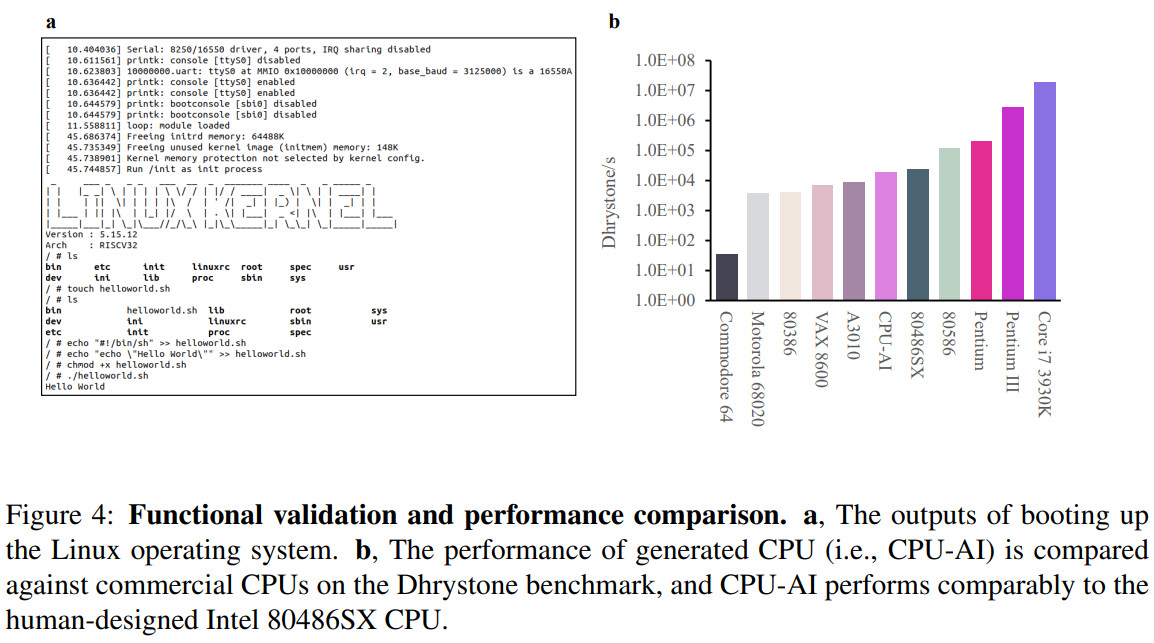 Prosesor RISC-V32IA yang dihasilkan dijuluki “CPU-AI” direkam pada litografi 65 nm dan beroperasi pada 300 MHz—hingga 600 MHz—dan berhasil menjalankan Linux, SPEC CINT 2000, dan Dhrystone, mirip dengan i486SX terhormat Intel dari tahun 1991.