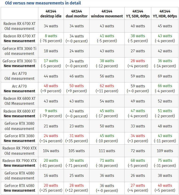Mengenai angka kinerja, pengujian tersebut membandingkan konsumsi idle desktop, konsumsi daya monitor ganda, pergerakan Windows, YouTube dengan SDR pada 60 FPS, dan YouTube dengan HDR pada 60 FPS, semuanya dilakukan pada pengaturan monitor 4K 144 Hz.