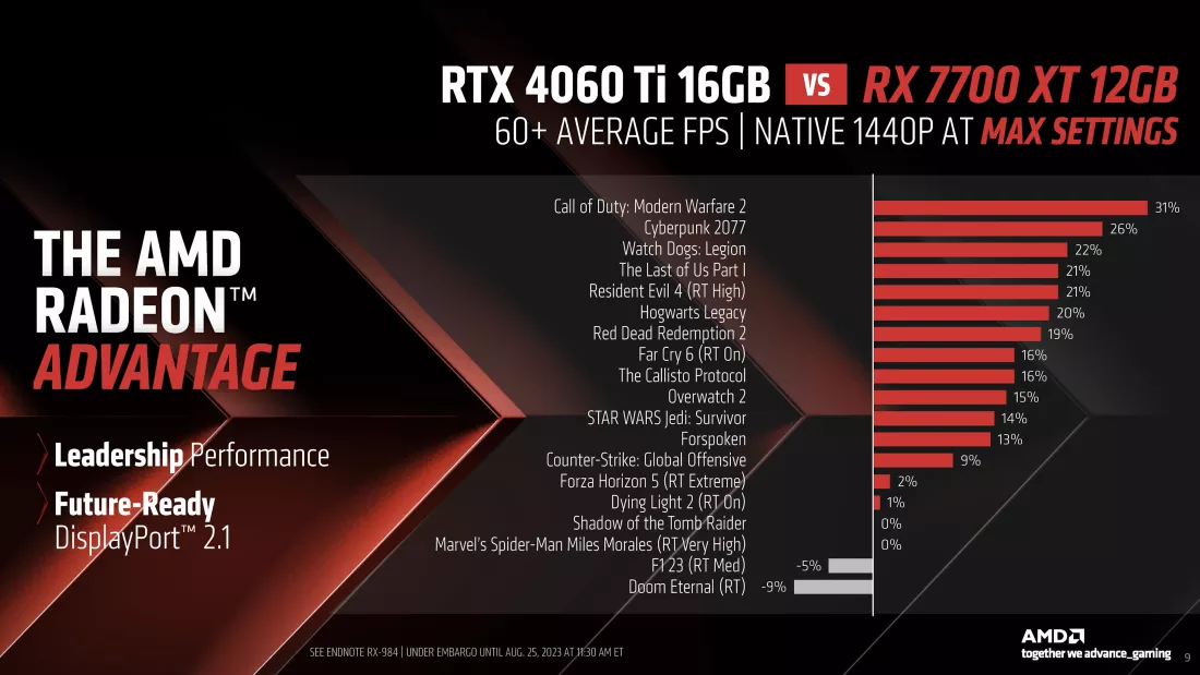 Pilihan AMD untuk melakukan benchmark terhadap RTX 4070 dan RTX 4060 Ti 16 GB sangatlah strategis, karena harga RX 7800 XT dan RX 7700 XT dimaksudkan untuk bersaing dengan rekan-rekan NVIDIA ini.