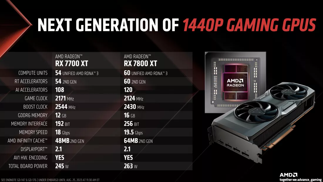 Radeon RX 7800 XT dibanderol dengan harga $499 atau kisaran 7.6 jutaan, sedangkan RX 7700 XT dibanderol dengan harga $449 atau kisaran 6.8 jutaan. Kedua kartu grafis tersebut akan tersedia untuk dibeli mulai 6 September 2023.