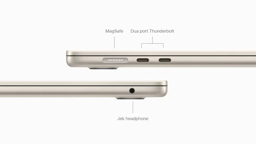 - MacBook Air 2022 memiliki dua port Thunderbolt 4, sedangkan MacBook Air 2020 memiliki dua port Thunderbolt 3.