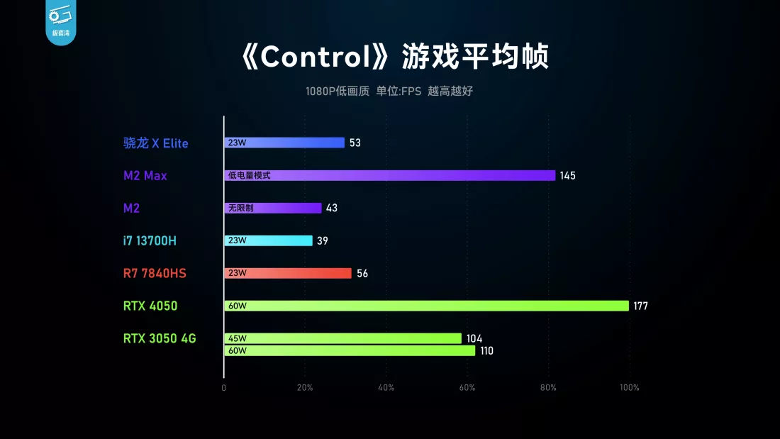 Performa gaming Snapdragon X Elite, khususnya dalam Kontrol game, sangat kompetitif. Kecepatannya mencapai 53fps pada 1080p pada pengaturan rendah, tertinggal jauh dari AMD Ryzen 7 7840HS. Pada 1440p, kinerja Ryzen turun, sementara Snapdragon mempertahankan sedikit keunggulan.