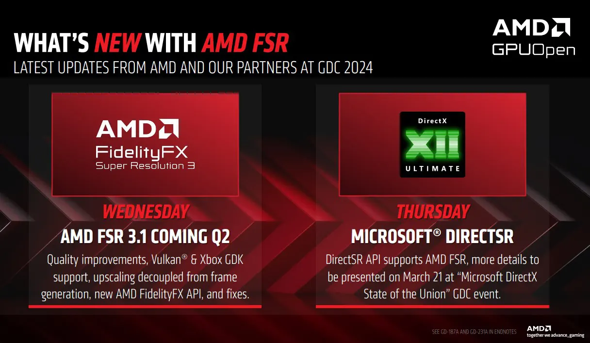 Direncanakan untuk diluncurkan dalam beberapa bulan mendatang, AMD FSR 3.1 menjanjikan sejumlah peningkatan kualitas, termasuk dukungan untuk Vulkan® dan Xbox GDK, memisahkan peningkatan dari pembuatan frame, dan memperkenalkan AMD FidelityFX API baru, serta perbaikan bug penting. Peningkatan ini siap untuk meningkatkan standar visual dan kinerja untuk game yang didukung secara signifikan.