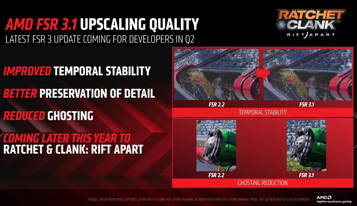 Salah satu fitur yang paling dinantikan dari AMD FSR 3.1 adalah peningkatan kualitasnya, yang ditunjukkan melalui gambar yang diambil dari cuplikan video Ratchet & Clank: Rift Apart yang berjalan pada 1080p dalam mode performa. Peningkatan penting mencakup peningkatan stabilitas temporal, pengurangan ghosting, dan pelestarian detail yang lebih baik, menjanjikan pengalaman bermain game yang menakjubkan secara visual dan mulus.
