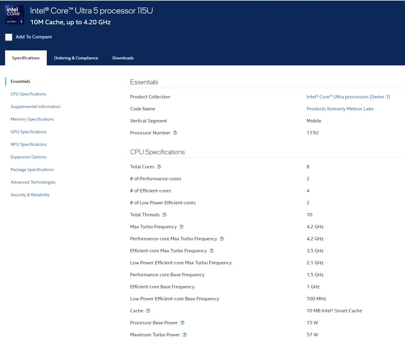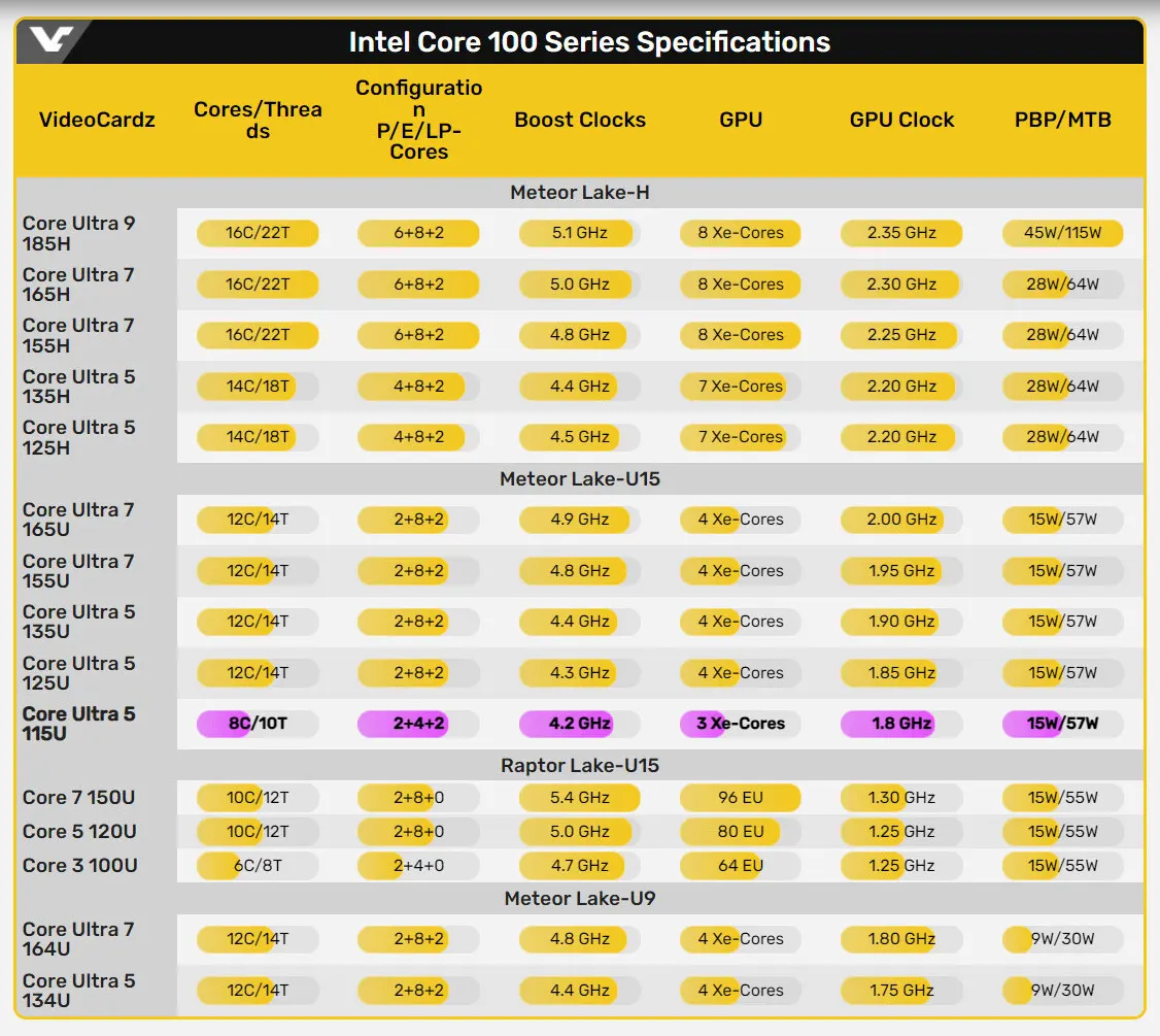 Menurut halaman produk resmi Intel, Core Ultra 5 115U memiliki fitur 8 core dan 10 thread, terdiri dari dua P-Cores, empat E-Cores, dan dua LP-Cores. Menariknya, unit grafis terintegrasi (iGPU) prosesor yang lebih lemah membedakannya dari rekan-rekannya di jajaran Meteor Lake. Meskipun SKU lain memiliki 4 Xe-Core atau lebih, 115U hanya dilengkapi dengan 3 Xe-Core, sehingga menimbulkan spekulasi mengenai klasifikasinya sebagai SKU “Ultra”.