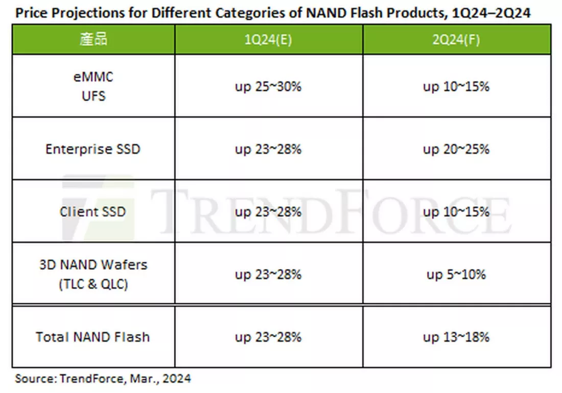 Sebuah laporan dari firma analisis pasar TI TrendForce menunjukkan bahwa harga SSD klien melonjak sebesar 23-28 persen di Q1 dan diperkirakan akan meningkat lebih lanjut sebesar 10-15 persen di Q2, meskipun permintaan di pasar ritel melemah.