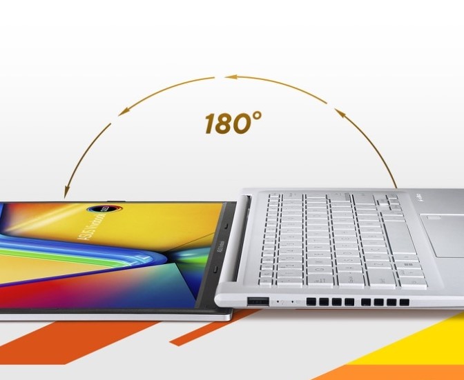 Vivobook 14 M1405YA juga dilengkapi engsel 180°, memungkinkan laptop diletakkan rata untuk memudahkan kolaborasi dan sudut pandang. Sampul plastik Indie Black menambah tampilan ramping.