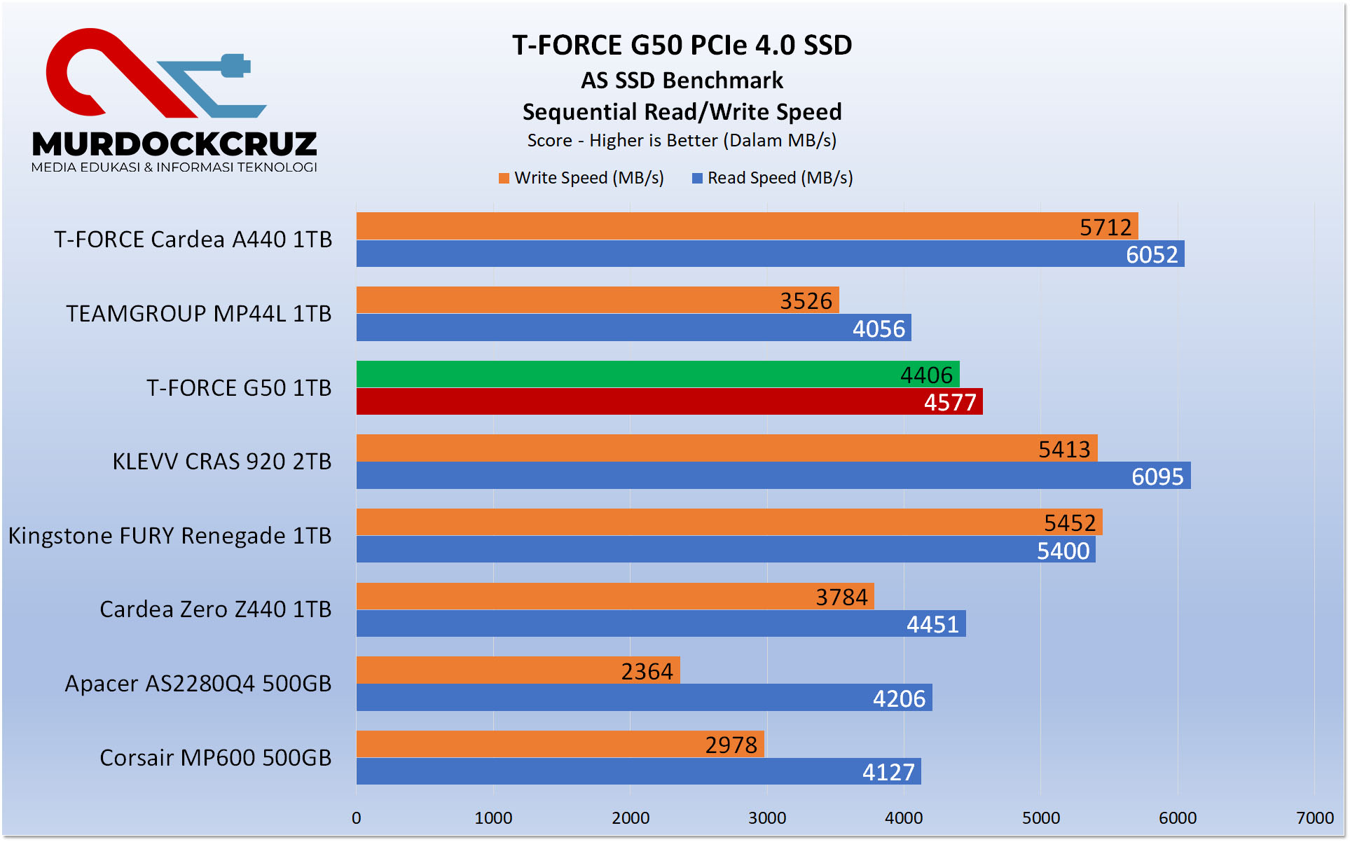 Dalam Benchmark AS SSD, T-FORCE G50 mengungguli MP44L, dengan kecepatan baca hingga 4,5 GB/dtk dan kecepatan tulis 4,4 GB/dtk. Performa tulisnya tetap konsisten, tak kalah jauh dengan kecepatan baca sekuensial.