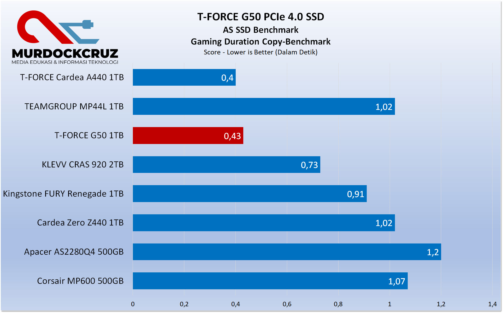 Dalam benchmark AS SSD Copy Gaming Duration, G50 menjadi yang tercepat kedua dibandingkan SSD terkemuka lainnya, hampir menyamai SSD terbaik yang diuji, Cardea A440.