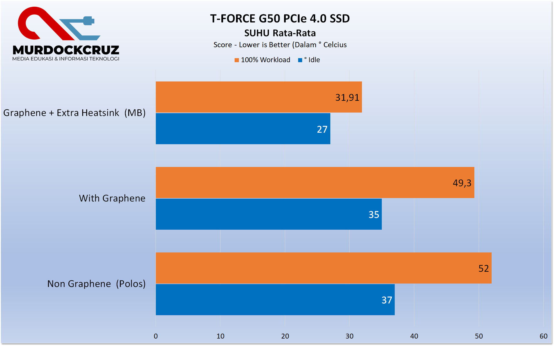 Dengan heatsink graphene, suhu idle turun sedikit hingga 35°C, dan suhu beban berat rata-rata 49°C. Meski penurunannya tidak drastis, namun tetap bermanfaat.