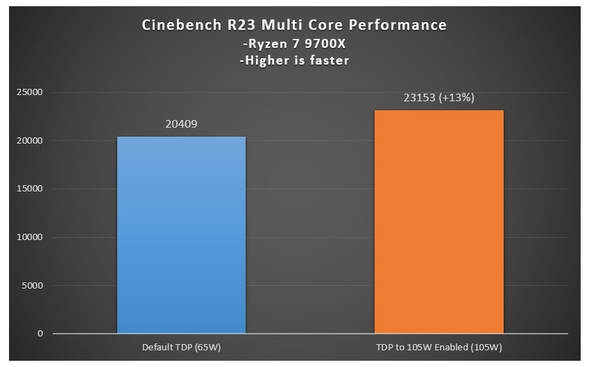 Hal terpenting dari pembaruan BIOS ini adalah opsi untuk meningkatkan TDP prosesor Ryzen 7 9700X dan Ryzen 5 9600X menjadi 105 W. Penyesuaian ini menghasilkan peningkatan performa sekitar 13% dibandingkan dengan TDP asli prosesor sebesar 65 W, sehingga menghasilkan daya dan efisiensi yang lebih tinggi untuk aplikasi dan beban kerja yang menuntut.