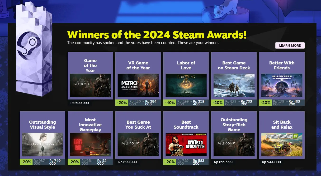 Berbeda dengan acara seperti The Game Awards yang melibatkan juri profesional, Steam Game Awards sepenuhnya ditentukan oleh suara pemain. Tahun ini, Black Myth Wukong berhasil menjadi bintang utama dengan menyabet gelar Game of the Year sekaligus meraih beberapa penghargaan penting lainnya.