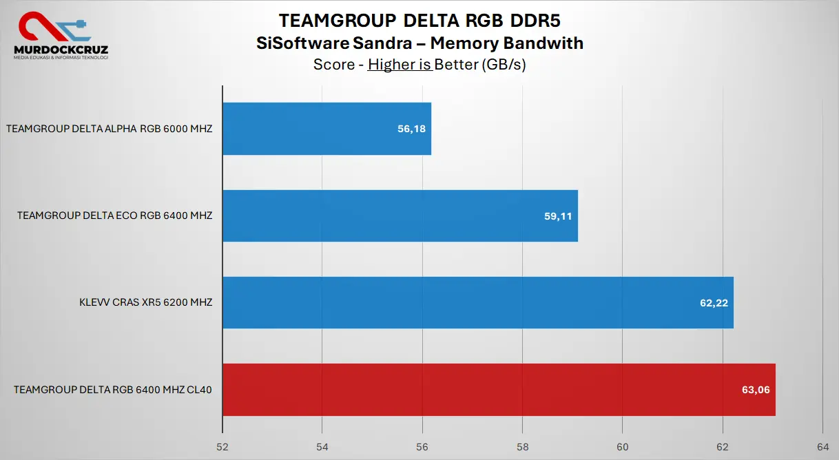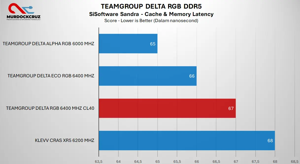 Secara bandwidth, Delta RGB memang unggul, tapi tidak terlalu jauh dari kompetitor di kelas kecepatan yang sedikit lebih rendah. Ini menunjukkan bahwa performa DDR5 sangat tergantung pada kombinasi frekuensi dan latency, bukan hanya angka MHz semata.
