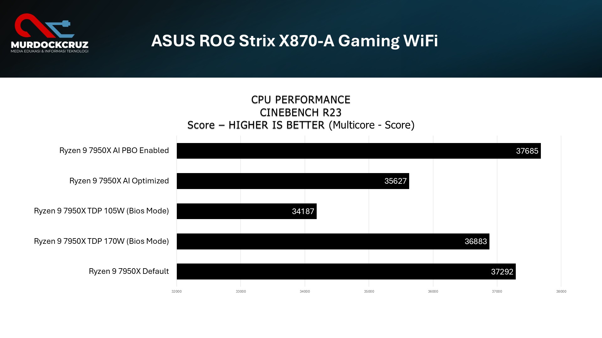 Pada pengujian prosesor dengan Cinebench R23, performa Ryzen 9 7950X berada di kisaran 37 ribu poin multi-core dalam kondisi default. ASUS juga menyediakan beberapa profil BIOS yang memudahkan pengguna memilih karakter performa. Misalnya, mode TDP 170W memberikan performa sedikit lebih rendah namun efisiensi daya tetap terjaga, sedangkan opsi AI PBO Enabled justru mampu meningkatkan skor hingga sekitar 37.600 poin. Fleksibilitas ini memungkinkan pengguna menyesuaikan penggunaan sesuai kebutuhan, baik fokus pada performa maupun konsumsi daya.