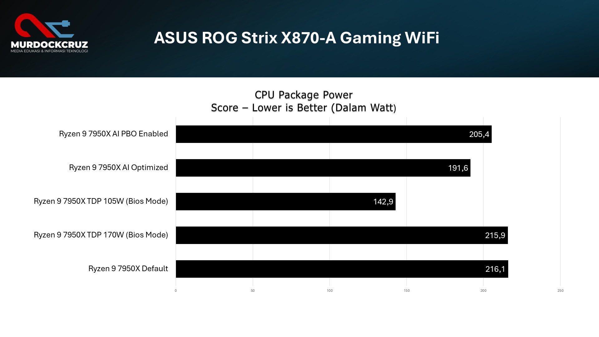 Dari sisi efisiensi, konsumsi daya CPU tercatat bervariasi antara 142 watt hingga 216 watt, tergantung profil BIOS yang digunakan. Suhu operasional juga terjaga dengan baik, dengan rata-rata suhu VRM sekitar 52°C, chipset 44°C, dan papan utama sekitar 31°C. Angka ini tergolong aman bahkan untuk penggunaan dengan prosesor kelas atas.