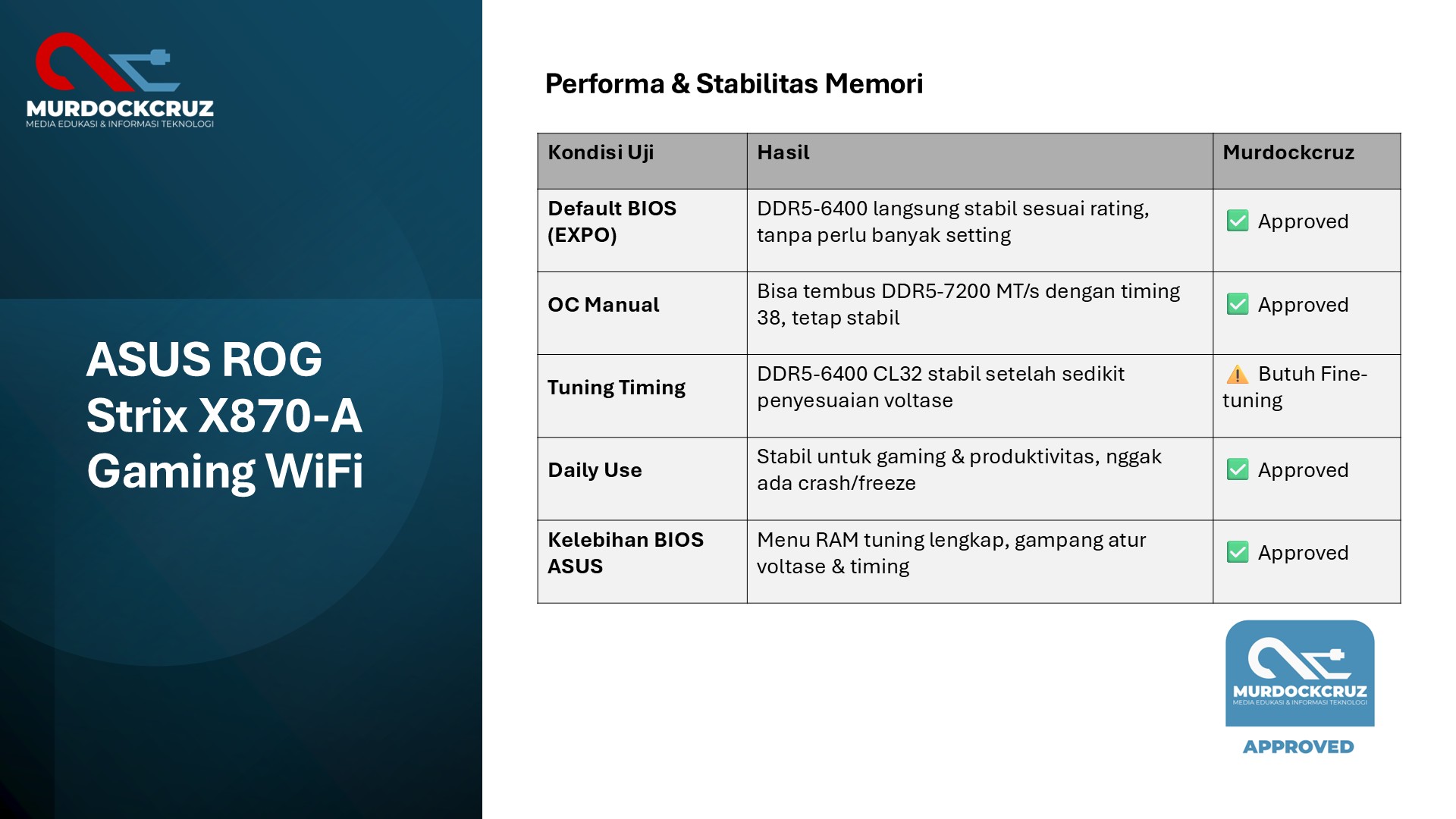 Secara keseluruhan, performa yang ditawarkan Strix X870-A Gaming WiFi konsisten, stabil, dan memberikan fleksibilitas pengaturan yang cukup luas, meskipun tetap berada sedikit di bawah seri flagship.