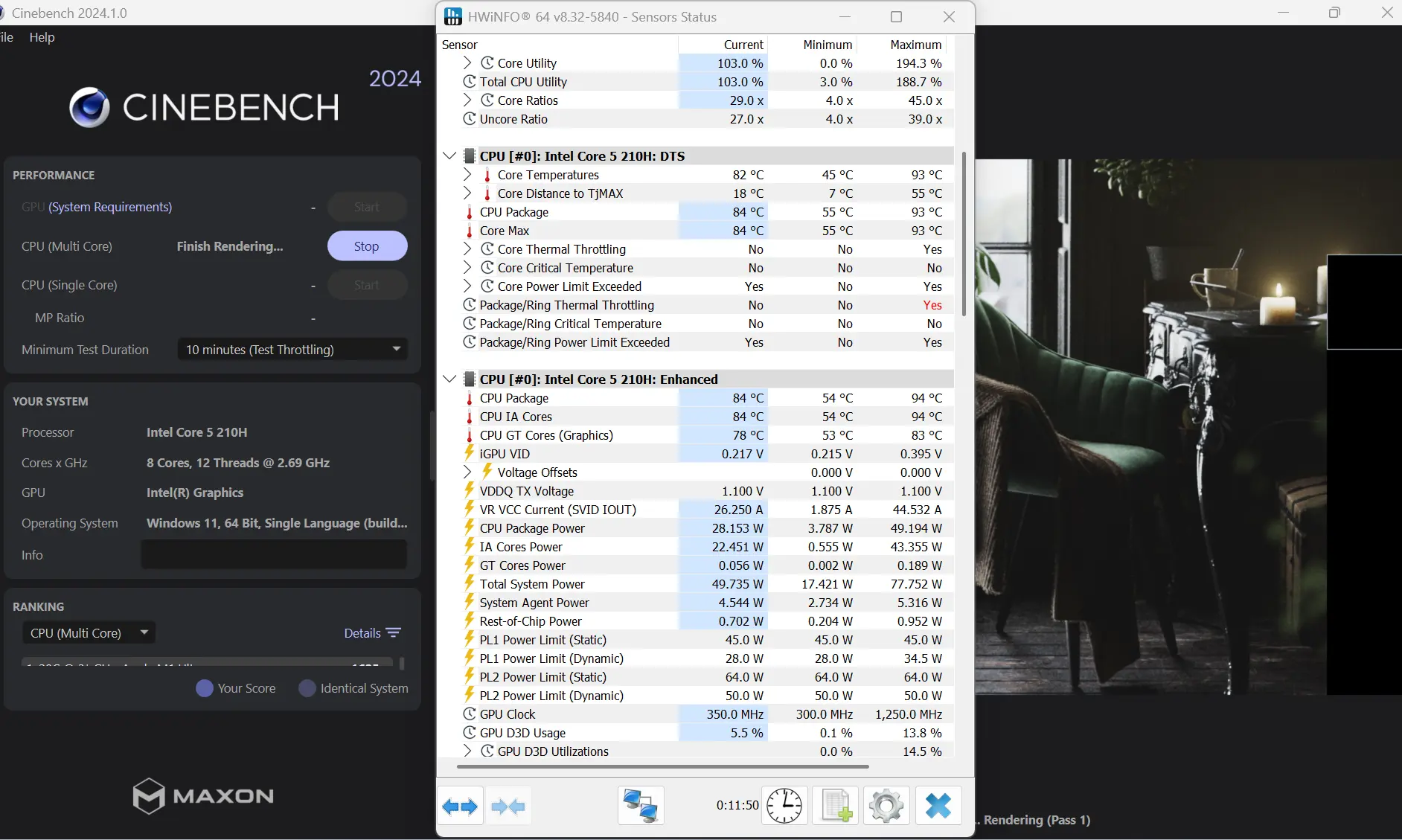 Dalam pengujian Cinebench R23, skor multi-core yang diperoleh ada di kisaran 9643 poin, sementara single-core mencatat sekitar 1624 poin. Di Cinebench 2024, hasilnya mencapai 465 poin multi-core dan 85 poin single-core. Skor ini secara umum masih setara dengan prosesor generasi sebelumnya seperti Intel Core i5-13420H, yang menandakan bahwa peningkatan performa dari seri “Core 5” belum signifikan.