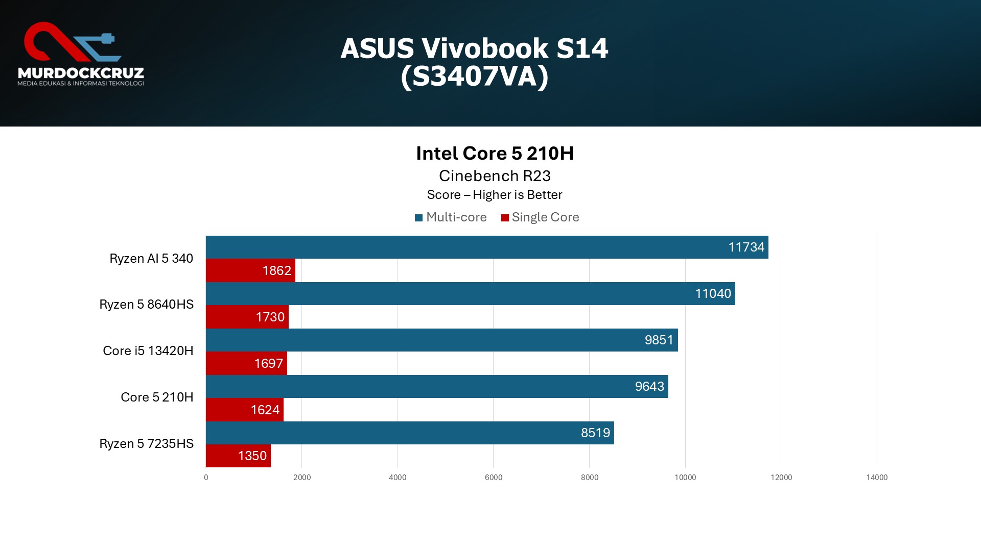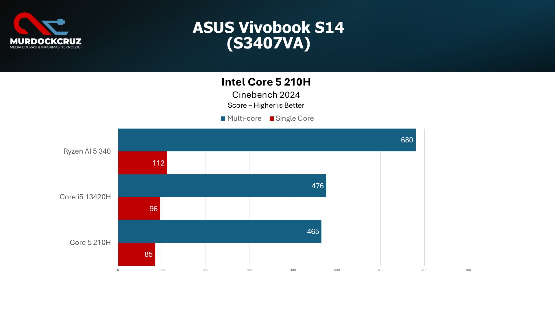 Masuk ke bagian performa, ASUS Vivobook S14 (S3407VA) ini terlihat cukup menarik di atas kertas dengan CPU Intel Core 5 210H—chip 8-core 12-thread dengan boost clock hingga 4.8GHz dan TDP maksimal 45W. Namun, hasil pengujian di dunia nyata menunjukkan bahwa potensi performanya belum sepenuhnya dimaksimalkan oleh desain tipis laptop ini.