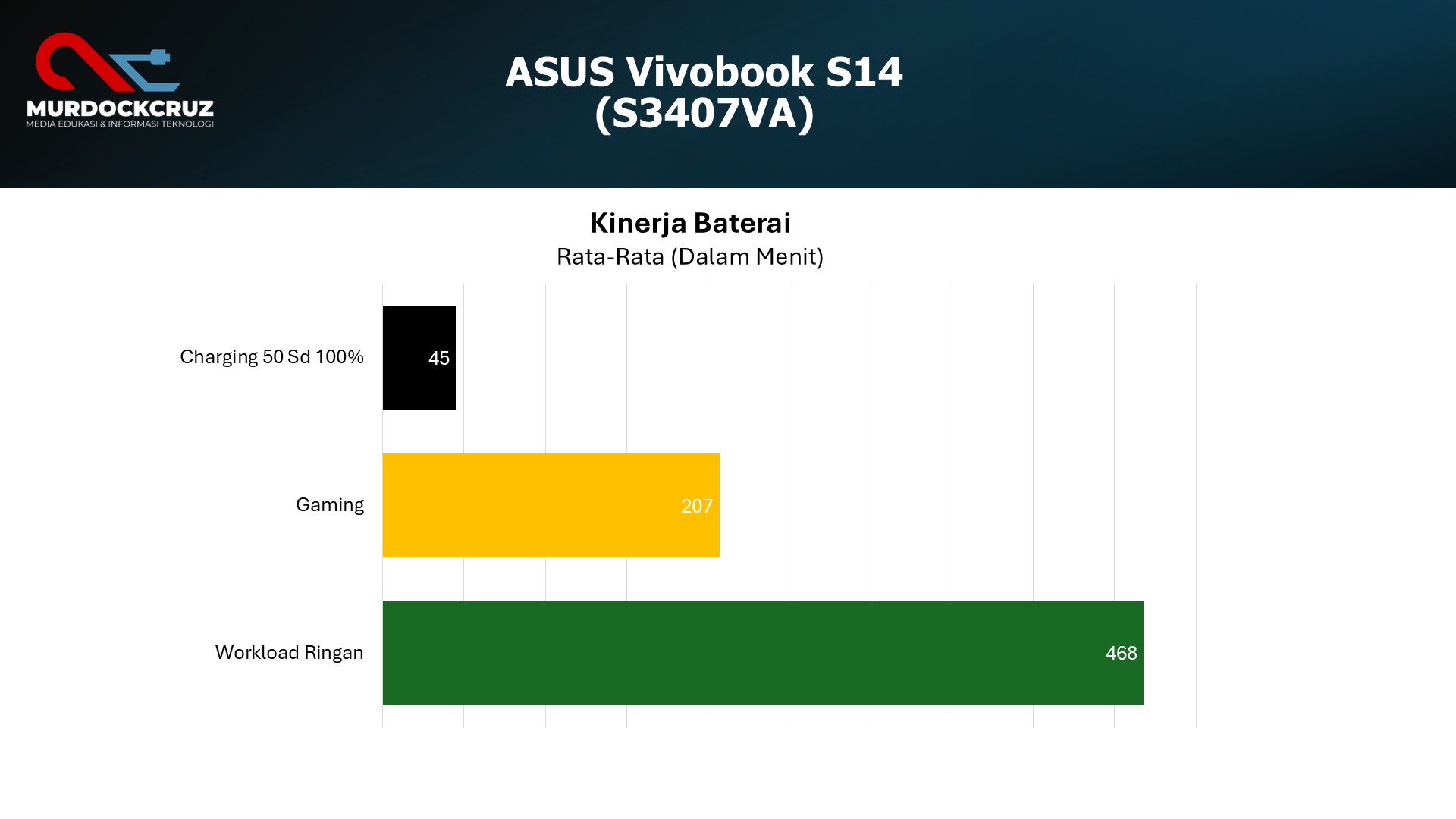 Secara keseluruhan, Vivobook S14 S3407VA menawarkan performa yang cukup untuk pekerjaan modern dan multitasking, tapi belum ideal untuk mereka yang mengejar performa mentah atau kestabilan jangka panjang di tugas berat. Faktor panas dan efisiensi pendingin masih jadi kompromi utama dari desain tipisnya