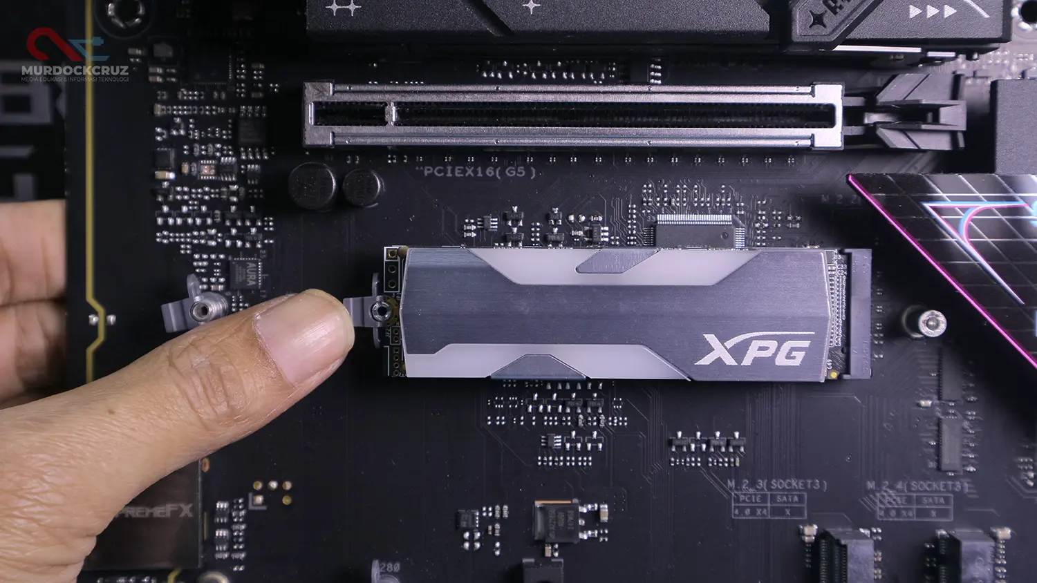 Slot PCIe sudah diperkuat, tetapi tidak semuanya menggunakan bracket metal ekstra. Untuk GPU kelas berat tetap aman, hanya saja bukan versi paling premium yang sering terlihat di seri di atasnya.