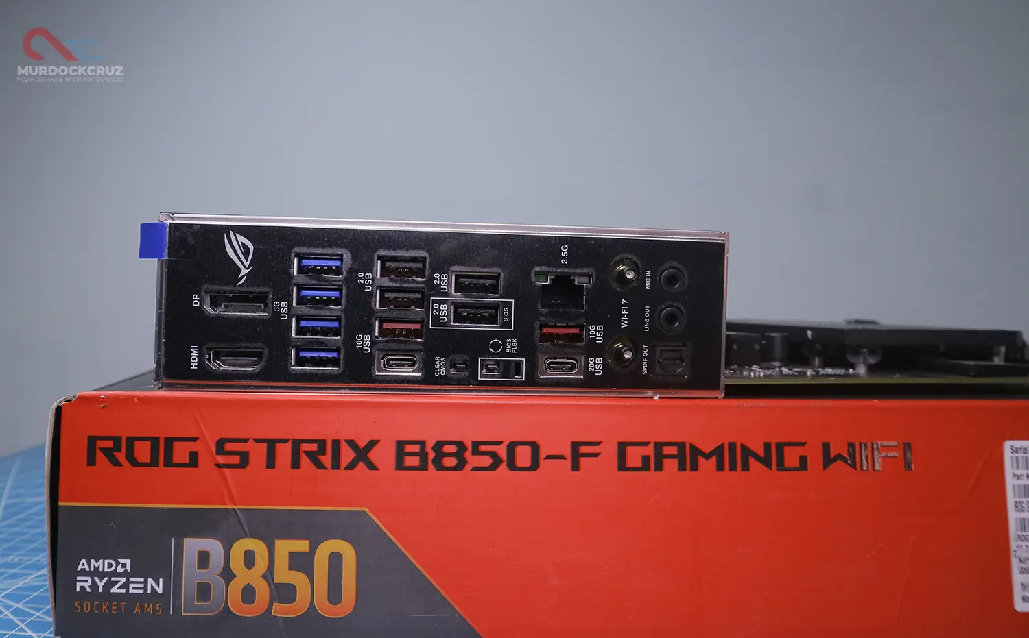Di bagian konektivitas jaringan, motherboard ini sudah memakai WiFi 7 dan LAN 2.5G. Bukan fitur yang mengejutkan di kelas Strix, tapi cukup penting untuk memastikan platform ini tetap relevan dua–tiga tahun ke depan. Panel belakangnya juga lumayan lengkap, dengan sejumlah port USB berkecepatan tinggi termasuk USB 20Gbps untuk perangkat eksternal yang butuh transfer data besar.