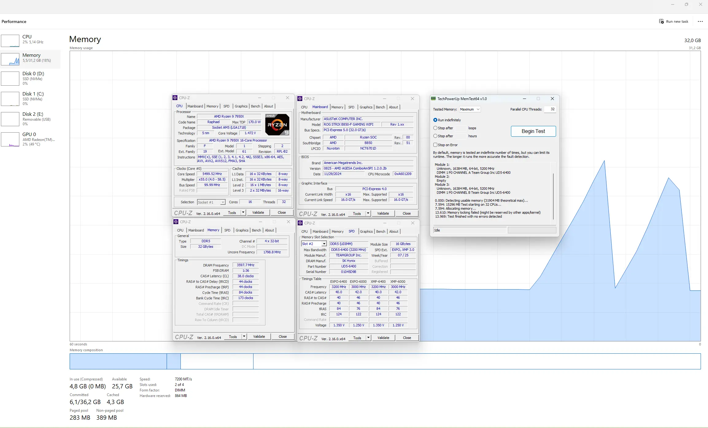 Saat memori didorong ke 7200 MHz dengan timing CL38-44, B850-F kembali menunjukkan kualitas tuning-nya. Tidak ada loop boot, tidak ada WHEA error, dan stress test berjalan lancar. Ini menandakan kalau desain signal integrity, topologi memori, dan BIOS tuning di board ini memang sudah matang.