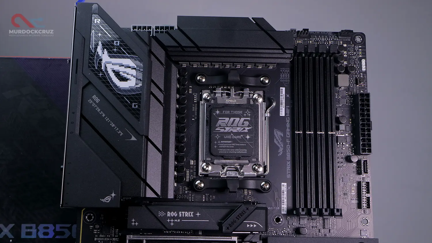 Di atas kertas, ROG Strix B850-F Gaming WiFi membawa fondasi yang sama dengan tipikal motherboard seri B terbaru ASUS, tapi dengan sentuhan yang lebih agresif khas lini Strix. Chipset AMD B850 menjadi pusatnya—chipset mainstream baru yang sudah mendukung prosesor Ryzen 9000 Series maupun seri 7000 sebelumnya. Kalian bisa memasang CPU hingga kelas Ryzen 9 tanpa perlu khawatir bottleneck dari sisi motherboard.