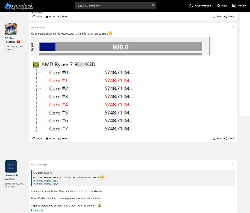 Dalam pengujian menggunakan motherboard Gigabyte X870 AORUS TACHYON ICE, sampel prosesor yang diduga kuat adalah Ryzen 7 9850X3D tersebut berhasil menyentuh kecepatan 5.748,71 MHz (5.75 GHz) secara stabil di kedelapan core-nya.