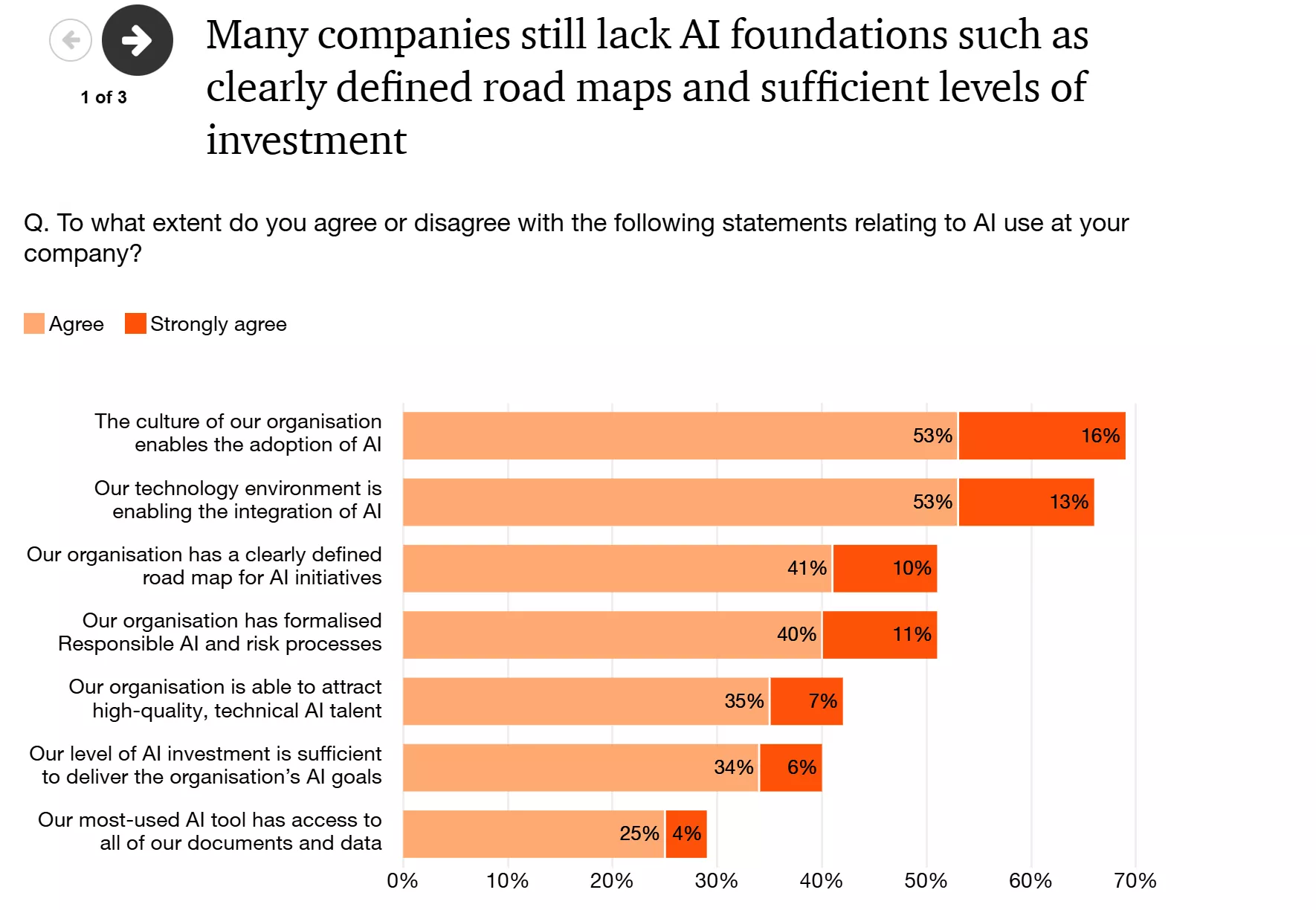Masalah utama bukan hanya pada teknologi, tapi pada sumber daya manusia. Sekitar 69% CEO percaya bahwa AI generatif akan menuntut sebagian besar tenaga kerja mereka untuk mempelajari keterampilan baru dalam tiga tahun ke depan.